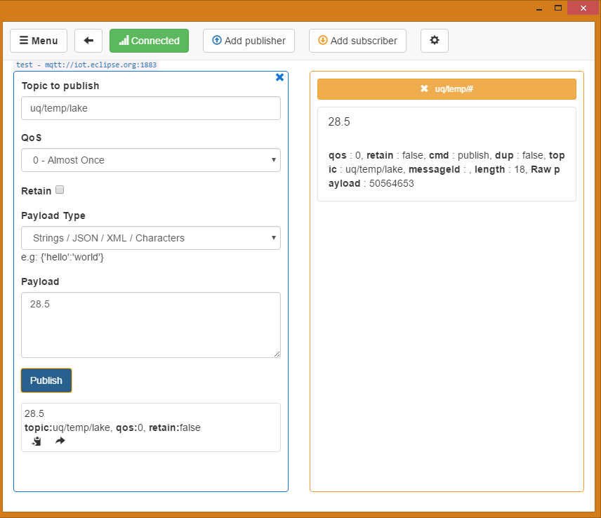The LoRaWAN gateway at UQ comes with an inbuilt mosquitto broker that we will use to publish IoT messages with,