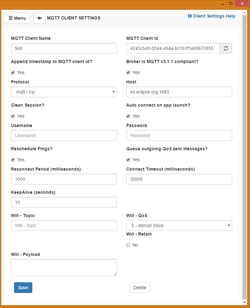broker supplied by Eclipse at iot.eclipse.org:1883 (1883 is the MQTT port).